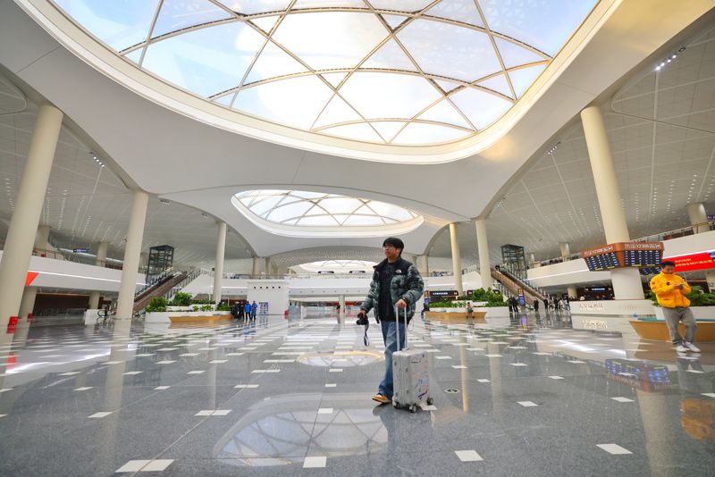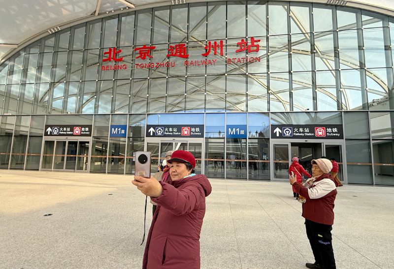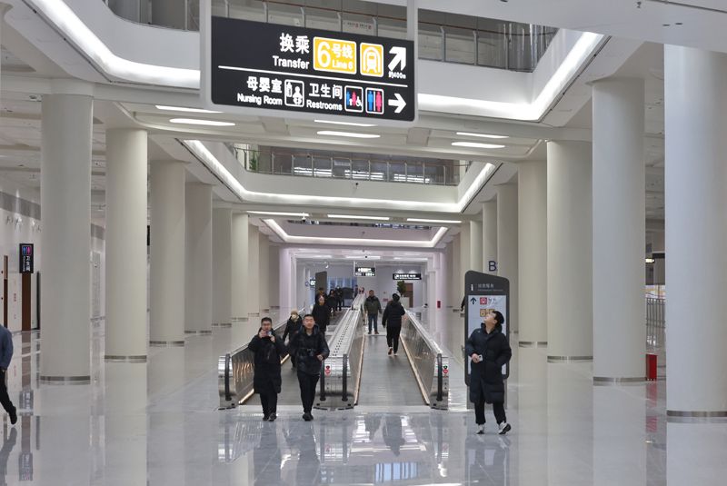 12月30日,市民来到北京通州站拍照打卡。首期投入使用的是以北京通州站为主的核心区域,包括地下夹层M1层、地下B1、B2、B3层,站外广场、换乘通廊、停车场及部分配套商业设施同步启用,旅客可实现京唐城际与地铁6号线、出租车、网约车、公交、巴士等的接驳换乘。