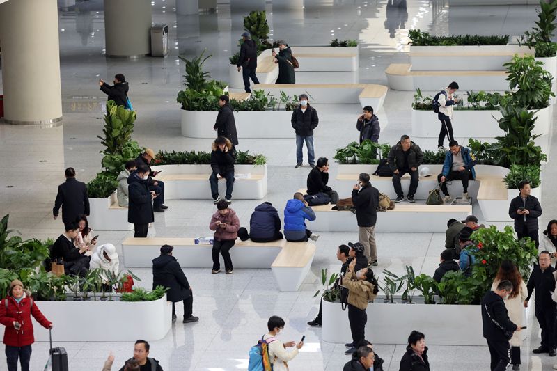 工作人员在北京城市副中心综合交通枢纽内开展引导服务。