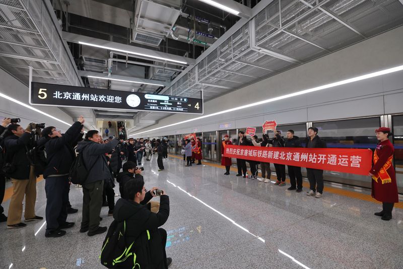 12月30日,北京通州站站台,乘务员拉起“庆祝北京通州站开通运营”横幅,旅客纷纷合影留念。