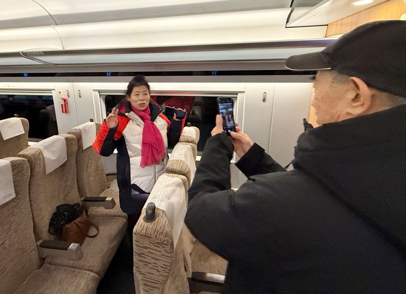 一位唐山旅客在G6751(北京通州-唐山)列车上拍照。