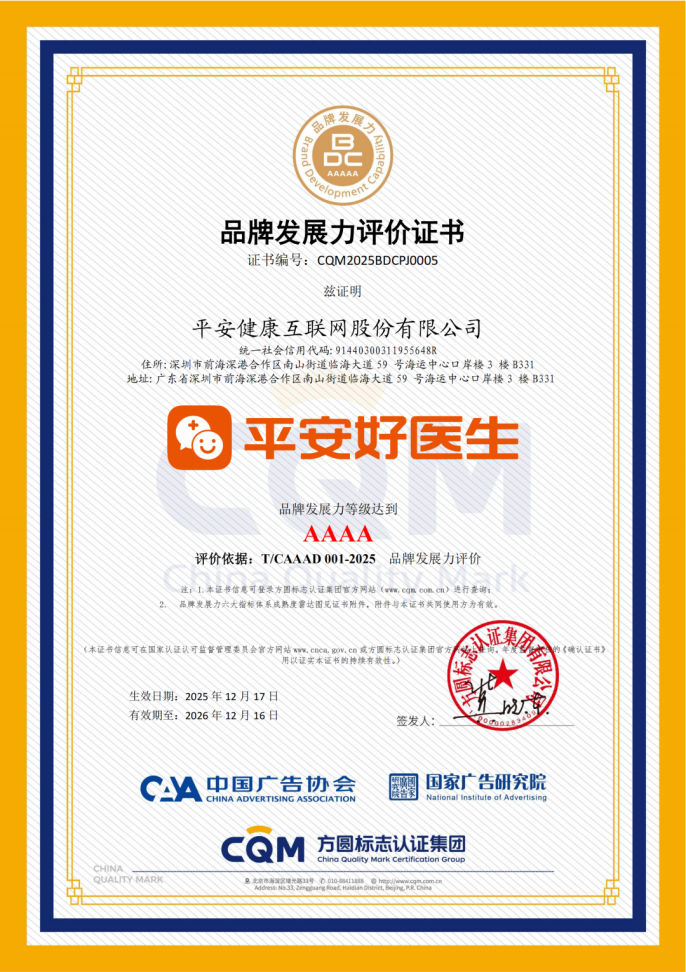 近日,经中国广告协会、国家广告研究院及方圆标识认证集团联合评定,授予平安健康互联网股份有限公司(以下简称:平安好医生)品牌发展力评级--AAAA级认证。品牌发展力评价是基于《品牌发展力》团体标准(T/AIAAD 001-2025),借助先进人工智能大模型与多维度数据分析,及众多品牌领域权威专家智慧,共同打造的第三方权威评价结果。该评级标志平安好医生在品牌价值提升处于突破领先地位,也成为国内数字健康行业品牌建设体系化、规范化发展的标杆典范。