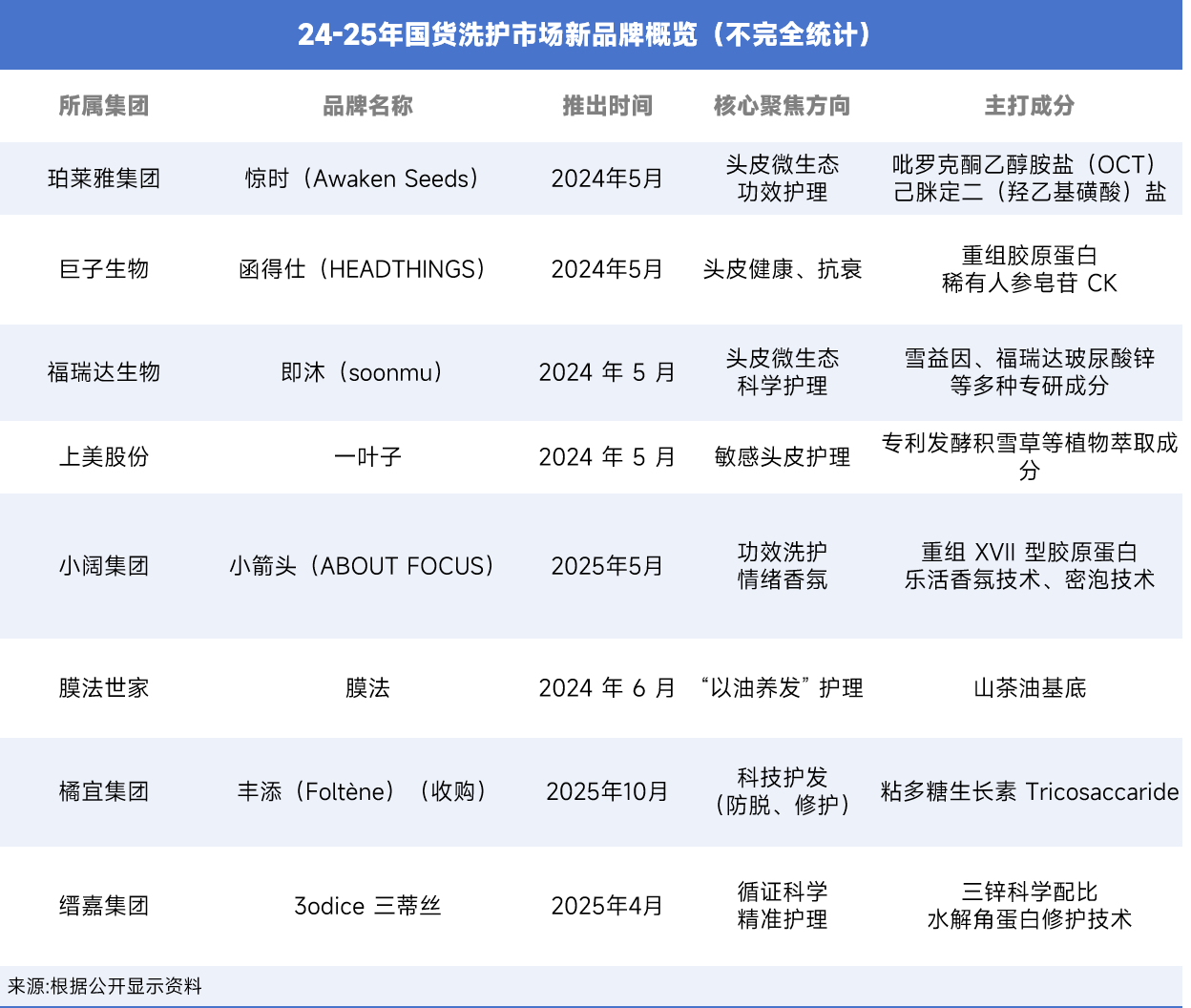 然而,随着Z世代成为消费主力,消费者对洗护发产品的需求正在升级,为国货品牌的崛起创造了机遇,外资主导的市场格局开始松动。2024年-2025年,国货集团集体押注入场,以珀莱雅、福瑞达、上美股份、橘宜等为代表的化妆品系企业,依托护肤基因,延伸洗护赛道,聚焦微生态功效护理、头皮健康与抗衰、敏感头皮护理、“以油养发”护理、防脱修护等方向,相继推出新品。