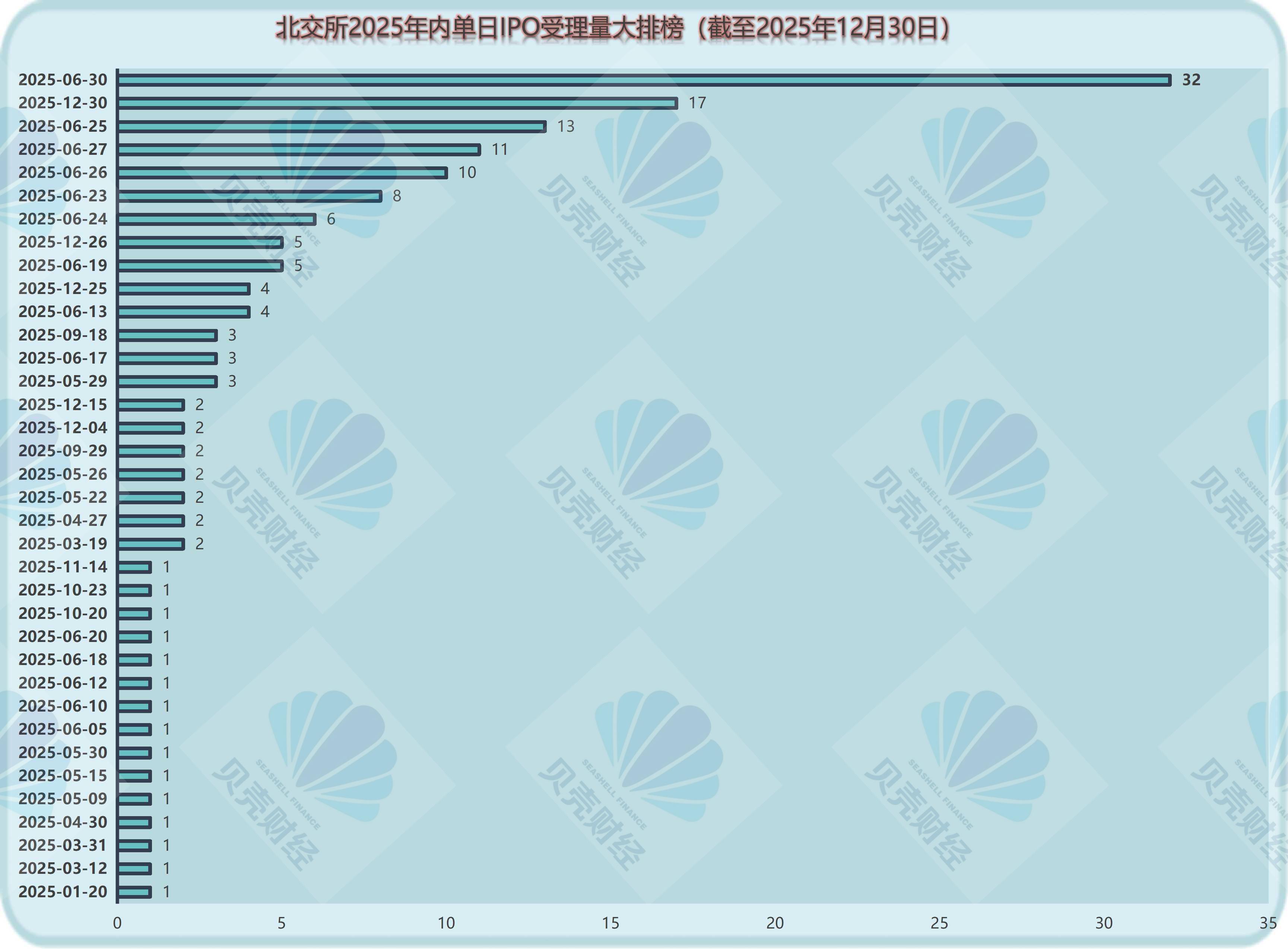 新京报贝壳财经讯(记者黄鑫宇)北交所单日IPO受理再现热潮。2025年12月30日,北交所一次性受理了17家企业的上市申报材料,使得本月受理总量升至30家。