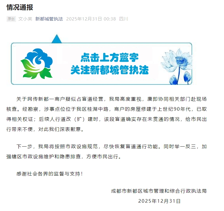新京报讯 据成都市新都区城市管理和综合行政执法局消息,关于网传新都一商户疑似占盲道经营,我局高度重视,赓即协同相关部门赴现场核查。经勘察,涉事点位位于我区桂湖中路,商户的房屋修建于上世纪90年代,已取得相关权证;后续人行道改(扩)建时,该段盲道确实存在未贯通的情况,给市民出行带来不便,对此我们深表歉意。