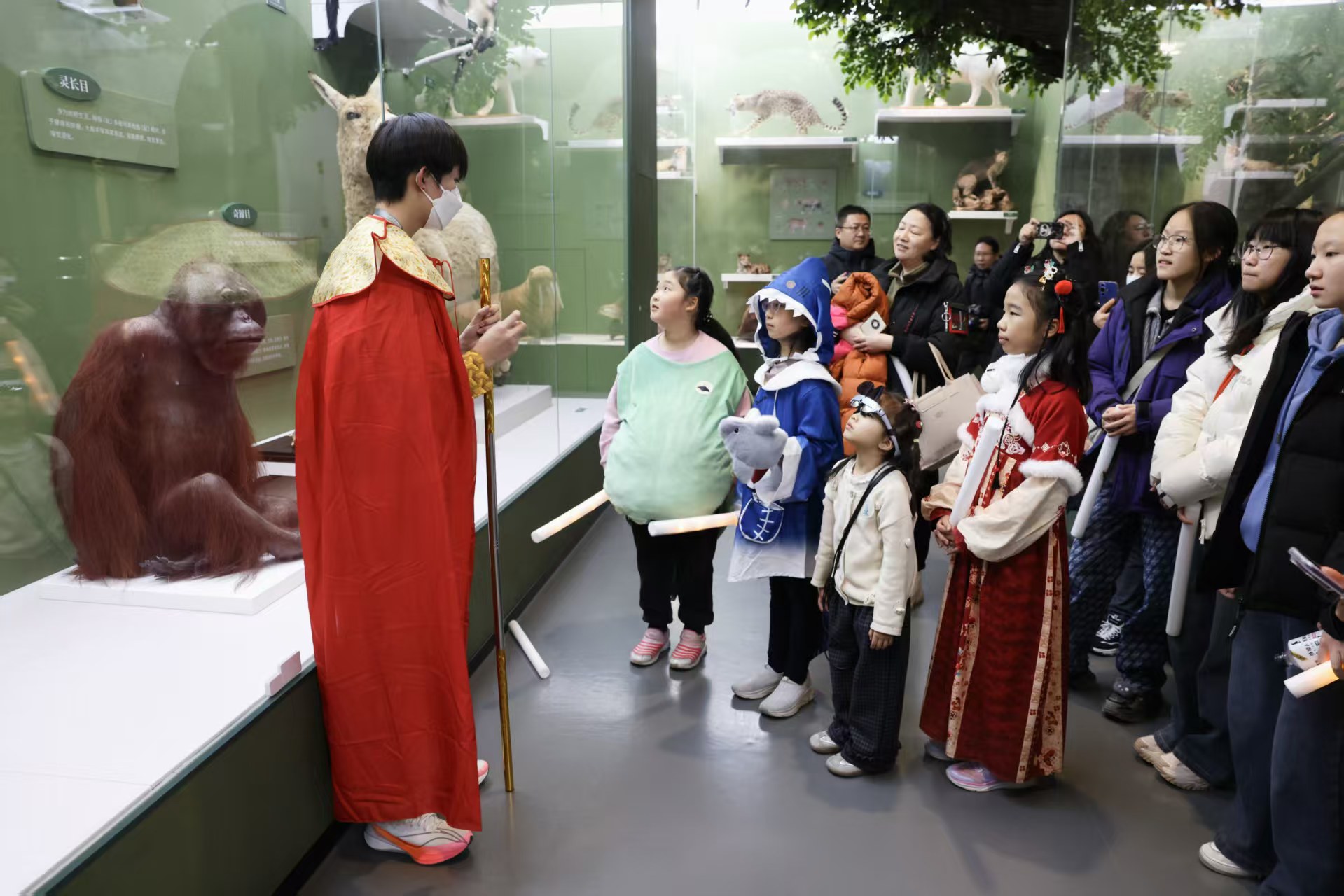 “孙悟空”志愿讲解员在为小朋友们讲解灵长类动物的知识。新京报记者 浦峰 摄