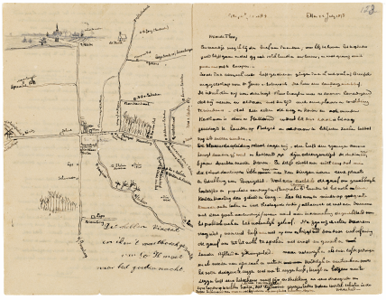 科尔(梵高最小的弟弟,全名康纳利斯·文森特·梵高)正在休假,今天早上我们又去了荒地和松林,路过磨坊再走一段路就到了。我们去为他的兔子采摘石楠花,它们非常喜欢吃这种植物。我们在松树林里坐了一会儿,一起画了一张埃滕及周边地区的地图,包括布莱斯堡、斯普伦德尔、赫特黑克和霍温等等。