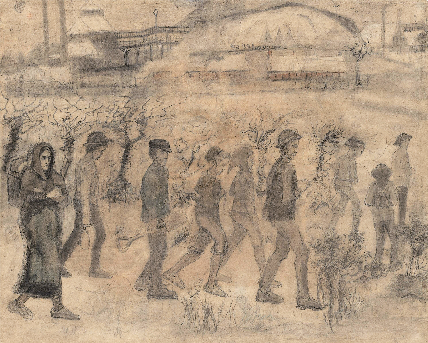 然而,我又忍不住画了一幅相当大尺寸的矿工去矿井工作的素描,就像我之前发给你的速写,但是略微改变了人物的排列顺序。