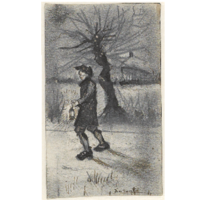 除了这些之外,我还描绘了送货员、矿工、扫雪的人、在雪地里散步的人、老妇人以及老头子(巴尔扎克小说《十三人故事》里的费拉居斯的形象)的形象等。我要送你两幅小画,《小径》和《在壁炉前》。我可以清楚地看到它们的不足,不过,已经开始出现好转的势头了。