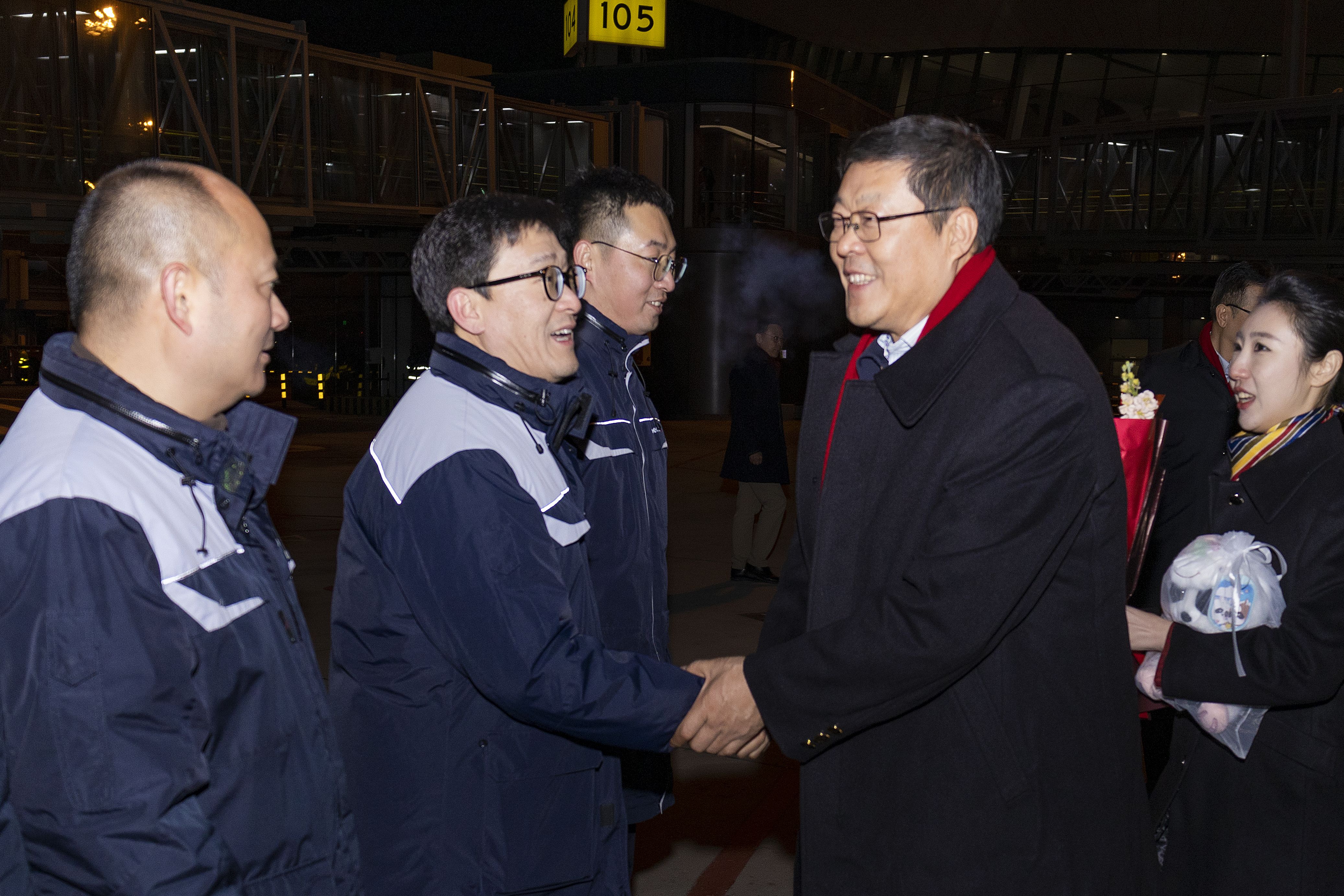 中航集团总经理、党组副书记王明远在北京首都国际机场慰问归航机组。