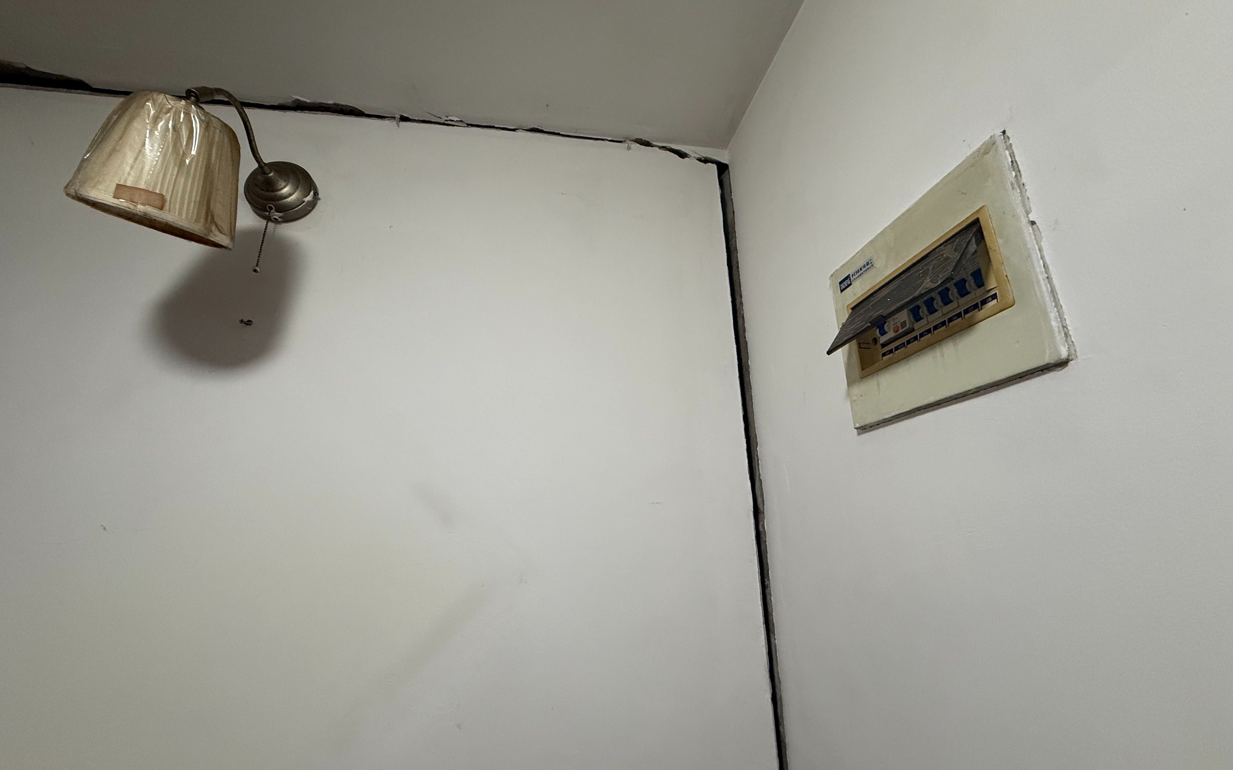 不只是客厅的墙面,一道道裂痕如枯树枝一般,蔓延到家里榻榻米的隔墙上。“毫不夸张地说,晚上睡觉时,我真能听到墙裂开的动静,‘吱吱吱’作响。”冯女士的母亲董女士告诉记者,裂缝从墙顶的角延伸到地面的角,而后便一发不可收拾。
