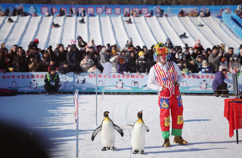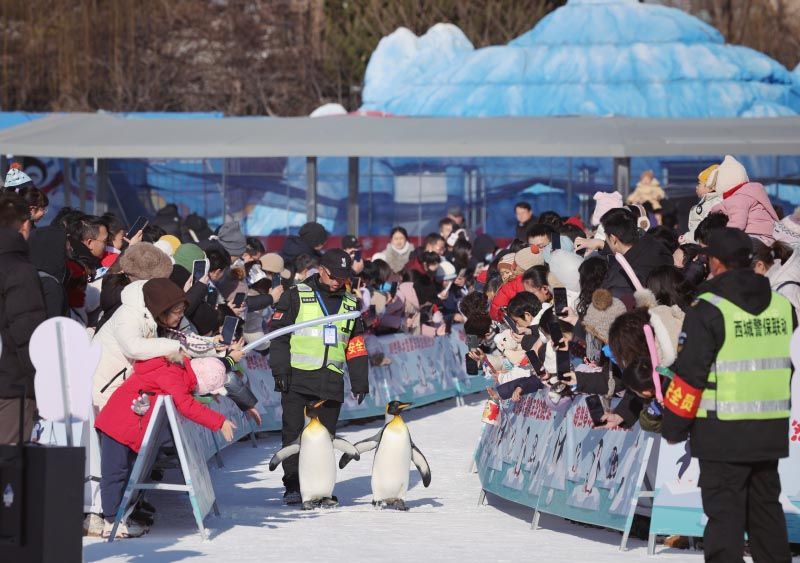 1月3日,元旦假期最后一天,陶然亭冰雪嘉年华,企鹅巡游吸引大量游客。