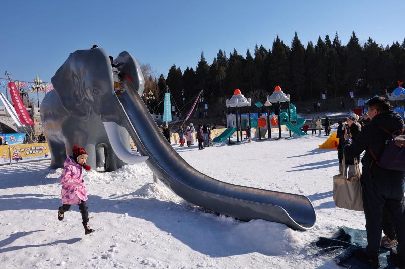1月3日,陶然亭公园,陶然亭冰雪嘉年华上,复古的大象滑梯大受欢迎。为丰富市民冬季文体生活,假日期间全市公园共推出传统民俗、冰雪嘉年华、跨年夜等85项生态文化活动。陶然亭公园、城市绿心森林公园、龙潭公园等20余家公园纷纷开启冰雪狂欢模式,推出丰富多样、各具特色的冰雪活动,涵盖雪地娱乐、冰上运动、主题景观打卡等多种形式,打造一站式冬日畅玩体验,为市民带来“冬景花园”的别样乐趣。