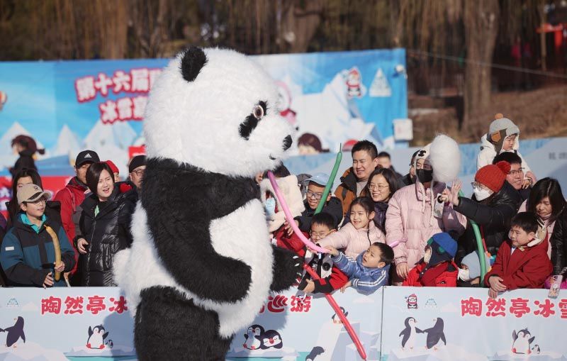 陶然亭冰雪嘉年华上,小朋友们争相跟“熊猫”打招呼。