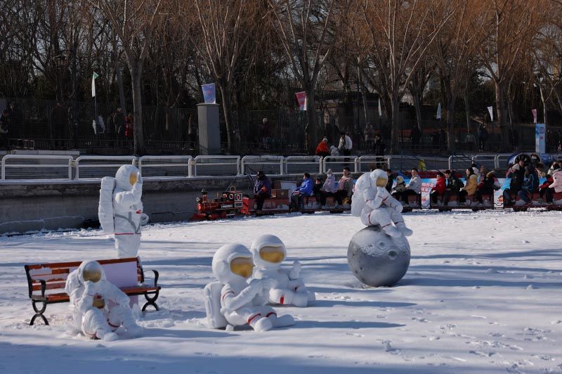 陶然亭冰雪嘉年华上,游客们玩雪地小火车。