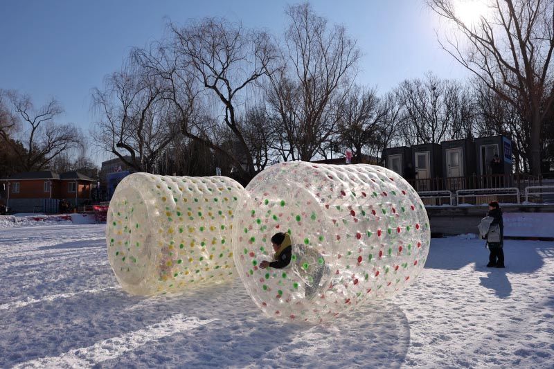 陶然亭冰雪嘉年华上,游客们在玩雪地悠波球。