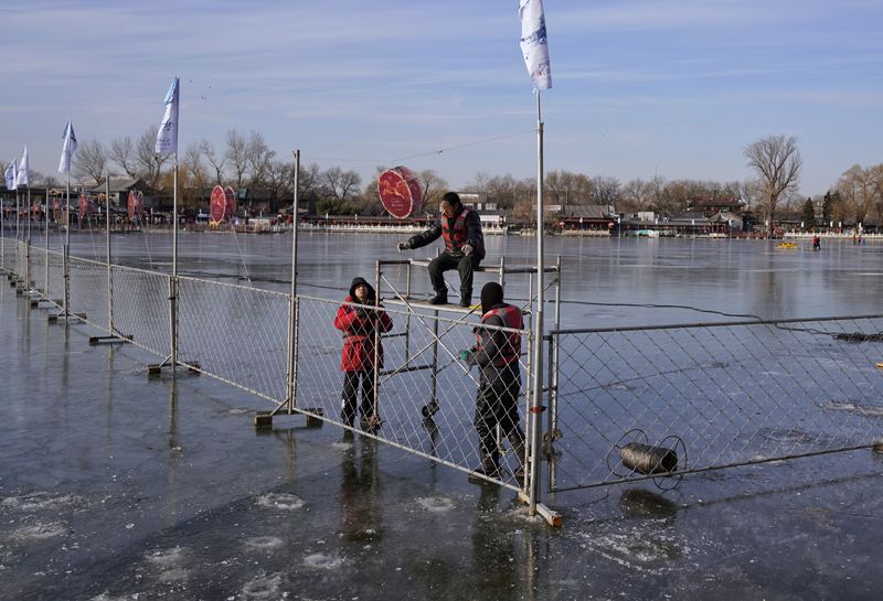1月4日,什刹海冰场,工作人员搭建冰场。