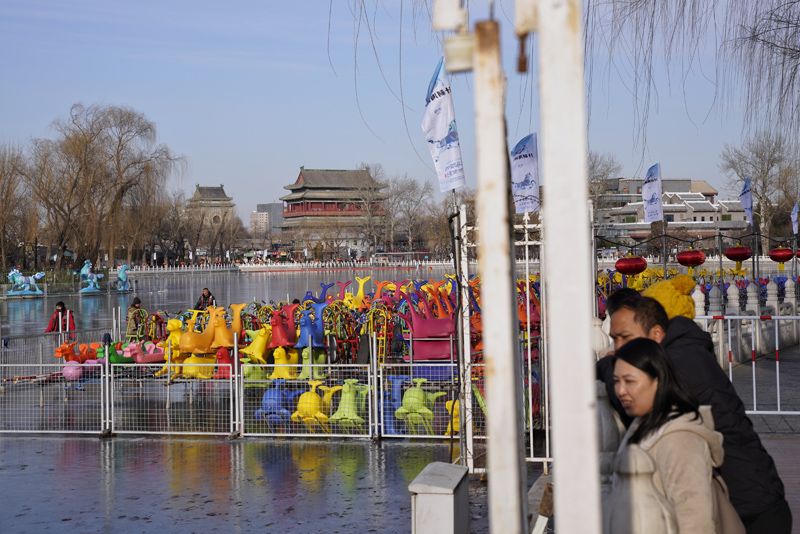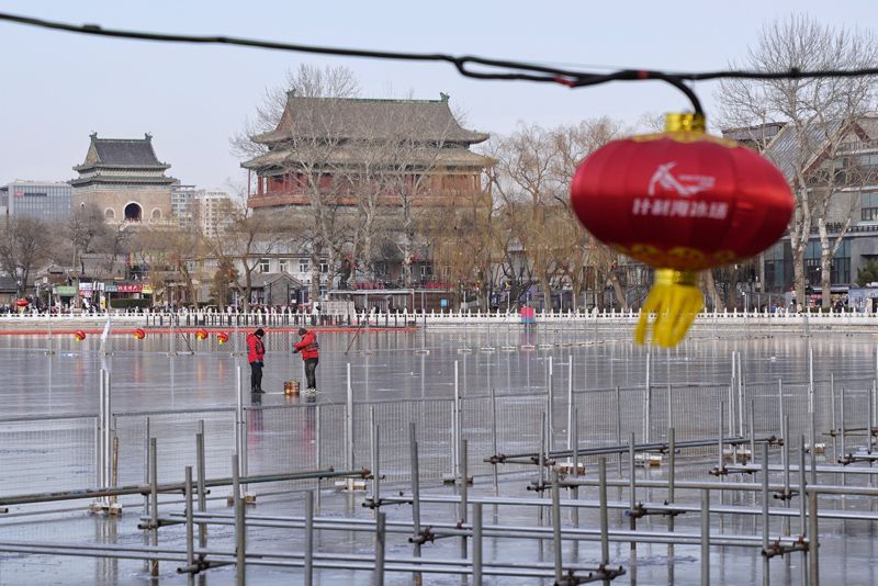 1月4日,什刹海冰场,游客趴在护栏上观看冰场的准备工作,询问冰场何时开业。