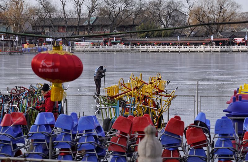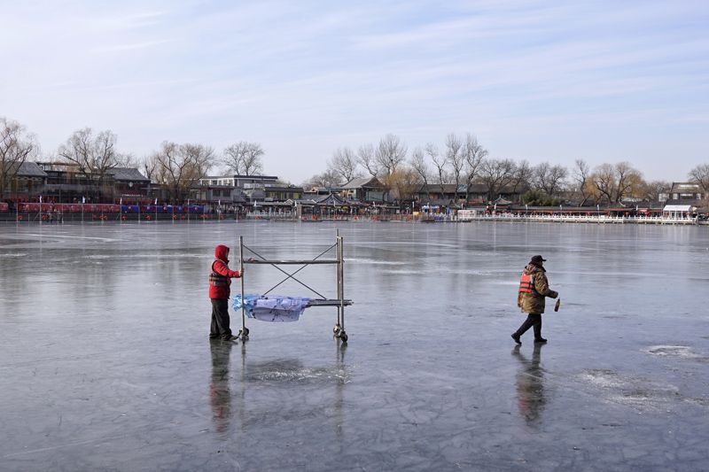 1月4日,什刹海,工作人员正在冰面上测量冰层厚度。这几天,什刹海冰场开始进入施工筹备阶段。新京报记者在现场看到,不少工作人员正在冰面进行搭建围栏、布置马年灯笼、搬运冰车、测量冰层厚度等前期准备工作。据现场工作人员介绍,由于近期气温较高,冰面厚度还未达到冰场开放标准,具体何时开业还需要看天气情况。