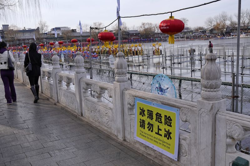 1月4日,什刹海,岸边护栏增设“冰薄危险 请勿上冰”安全警示标识,由于近期气温较高,什刹海冰面还未达到冰场开放标准。