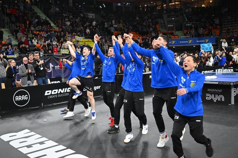 1月4日,樊振东和萨尔布吕肯队成员庆祝胜利。新华社发(乌尔里希·胡夫纳格尔摄)