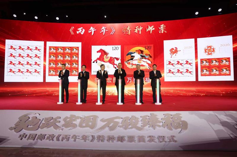 《丙午年》特种邮票由王红卫、赵恩重设计,北京邮票厂有限公司采用胶雕套印工艺印制。全套共2枚。第一枚邮票图案名为“驰跃宏图”,图中红马踏云、鬃毛如焰,表达了在新的一年里,对党领导下的国家社会经济发展继续行稳致远,朝“十五五”时期主要目标接续奋进的美好期许。第二枚邮票图案名为“万骏臻福”,图中三骏并驰、祥纹环绕,象征全国各族人民凝聚磅礴合力,在全面建设社会主义现代化强国、全面推进中华民族伟大复兴征程上协力同心。