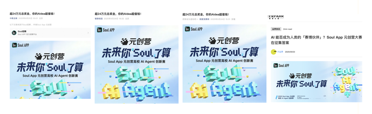 在传播策略上,Soul App一方面注重在高校及技术社群中进行深度渗透,另一方面也通过跨领域嘉宾、多平台联动等方式,推动赛事影响力的扩散。除了在高校内部的精准推广,赛事还积极联合多家AI Agent研发平台、开发者社区等垂直机构进行联合传播,借助其在特定技术圈层中的影响力,快速在目标人群中建立专业认知。此外,决赛还引入B站百大UP主等跨圈层评委,将赛事影响力从技术圈扩散至更广阔的青年文化圈层,引发了更广泛的社会化讨论。