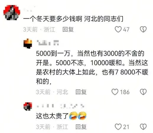 即便是冷得扛不住了才选择开暖气,河北农村家庭过冬的取暖费也得几千元。而农民一年收入也就一两万元,取暖费就占了不少,实在是担不起,行不通。