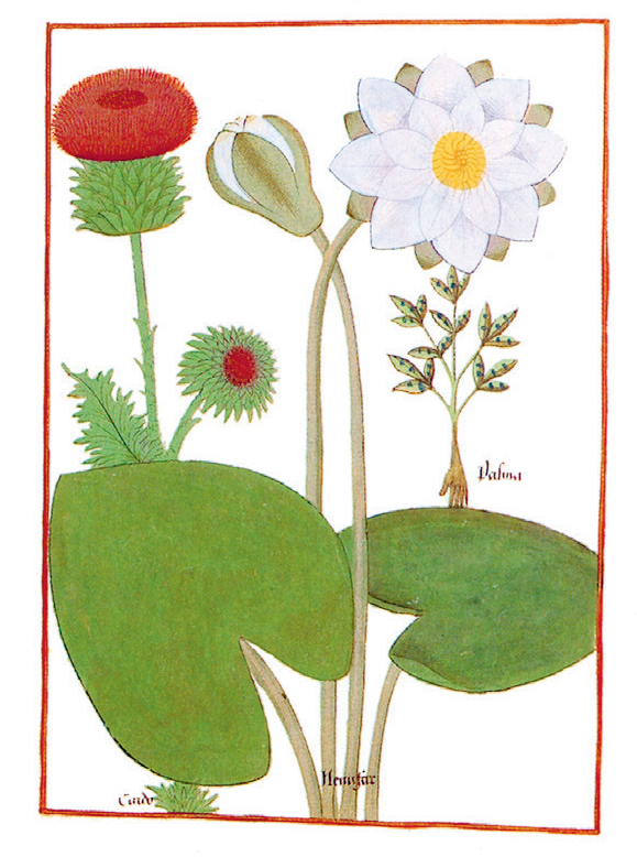 白睡莲、蓟和“上帝之手”。《植物圣经》插图