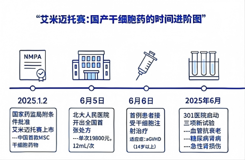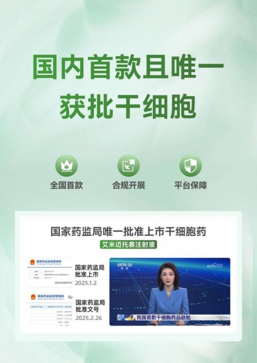 艾米迈托赛注射液的获批上市,在中国医药发展史上具有划时代意义。这是我国首个获得国家药监局批准的干细胞注射类药物,标志着干细胞治疗正式从临床研究走向规范化临床应用。