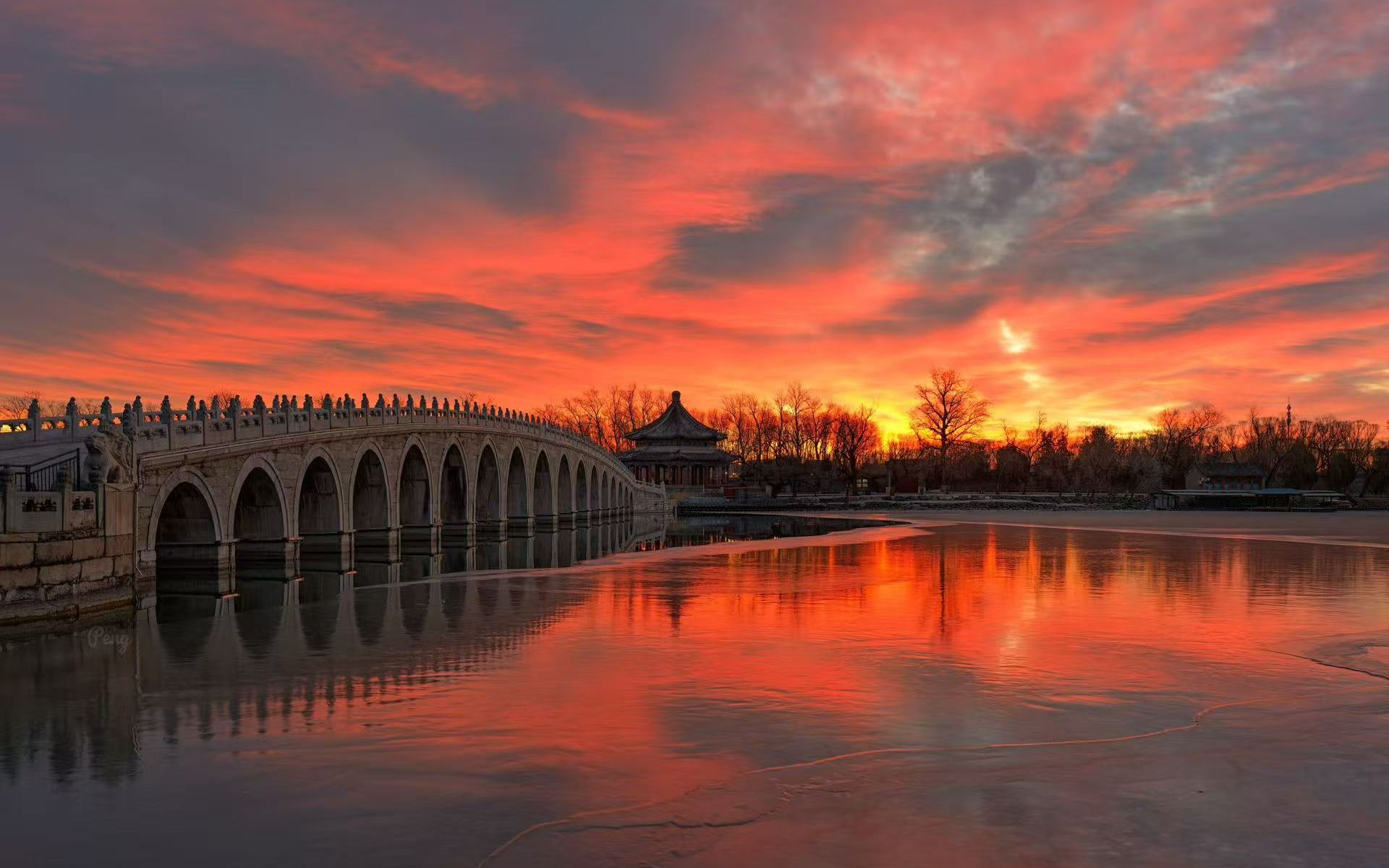 1月7日清晨,漫天彩霞与十七孔桥同框。颐和园供图