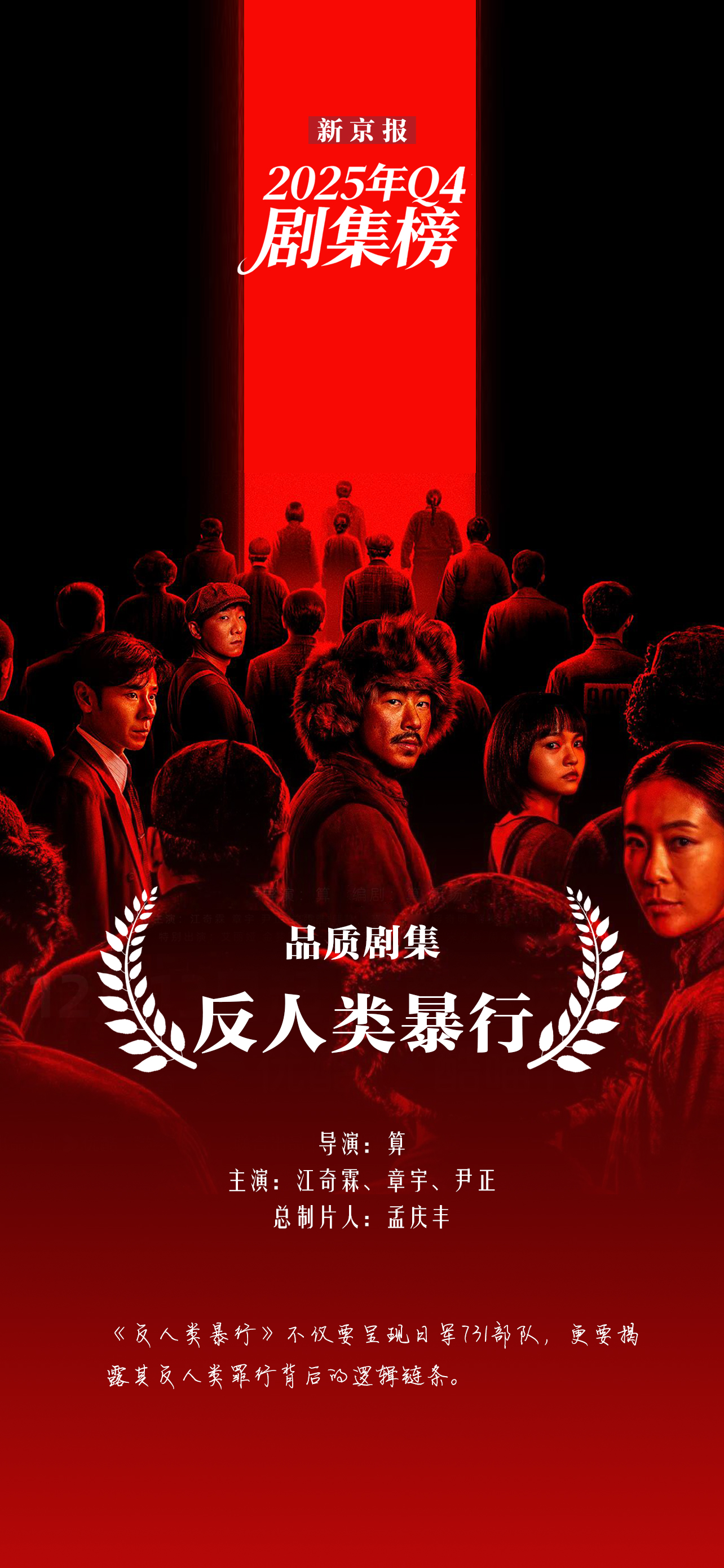 进入到2025年第四季度,各大平台的剧集也集中体现出优质、厚重的品质,整体热度上扬,而即便是传统意义上的“主旋律题材”,也都绽放出各自独特的叙事角度和审美追求,涌现出极具代表性的“大剧”。其中,全面揭露731部队体系化暴行的剧集《反人类暴行》,以一种庄严而克制的美学,完成了对一段黑暗历史的凝视与复原,该剧并未停留在暴行奇观的展示,而是以“双时空”设定,使“追寻”本身成为主题——它不仅是对罪证的追寻,更是对记忆、真相与历史正义的永恒追寻。