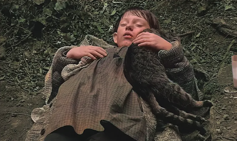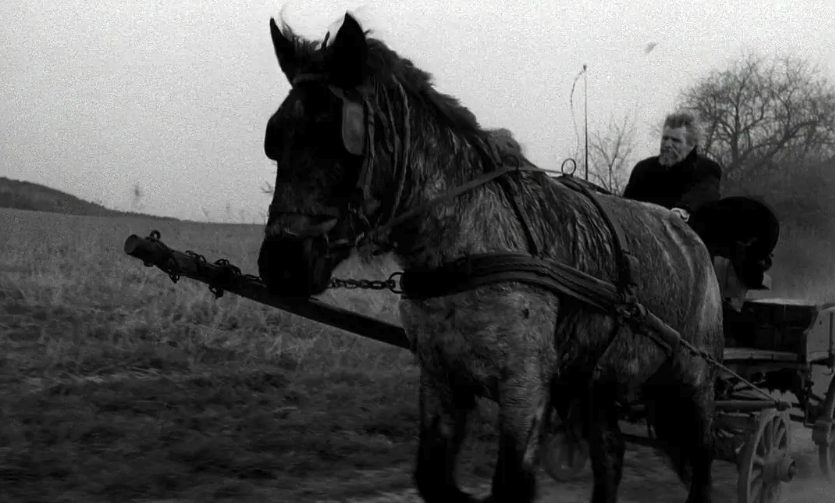自《诅咒》以来,动物作为人借以体验自身之界限的形象,栖居于贝拉· 塔尔的世界:从水坑里汲饮,在片末和克莱尔对吼的狗;《撒旦的探戈》里被共同体变卖的牛,逃离屠宰场的马,被伊斯泰克残害的猫;《鲸鱼马戏团》里可怖的鲸鱼;一直到海莉艾特的脖子上缠着的狐皮。在这里,没有一口供狗汲饮的水坑,没有一只可喂以牛奶,好对自己如法炮制的猫,没有过路的马戏团,只有一位宣布一切高贵的事物都消失了的预言家,还有一群被井水吸引的吉普赛人。除此之外,就只有马了,它浓缩了多个角色:它是干活的工具,是老奥尔斯多尔夫及其女儿的幸存手段。