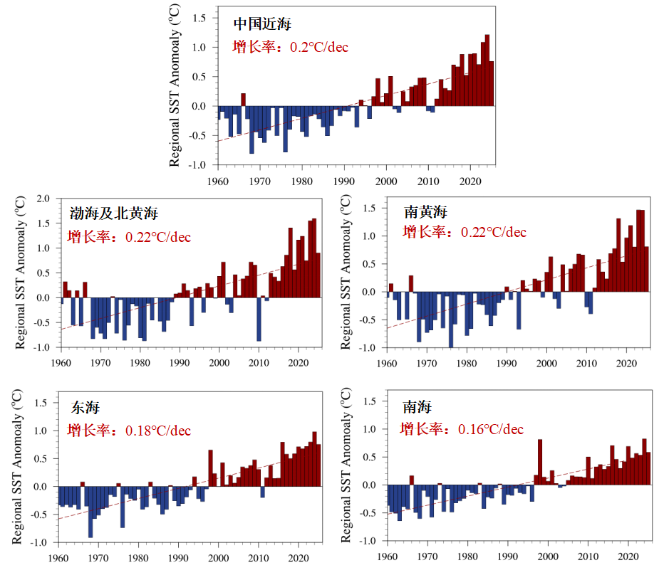 海表温度方面,2025年中国近海年平均海表温度为21.05℃,虽较2024年偏低0.45℃,但较常年仍偏高0.76℃。分海区来看,渤海及黄海北部升温最为明显,较常年偏高0.9℃;黄海南部、东海、南海分别较常年偏高0.81℃、0.75℃、0.58℃,四大海区均呈现显著暖化特征。