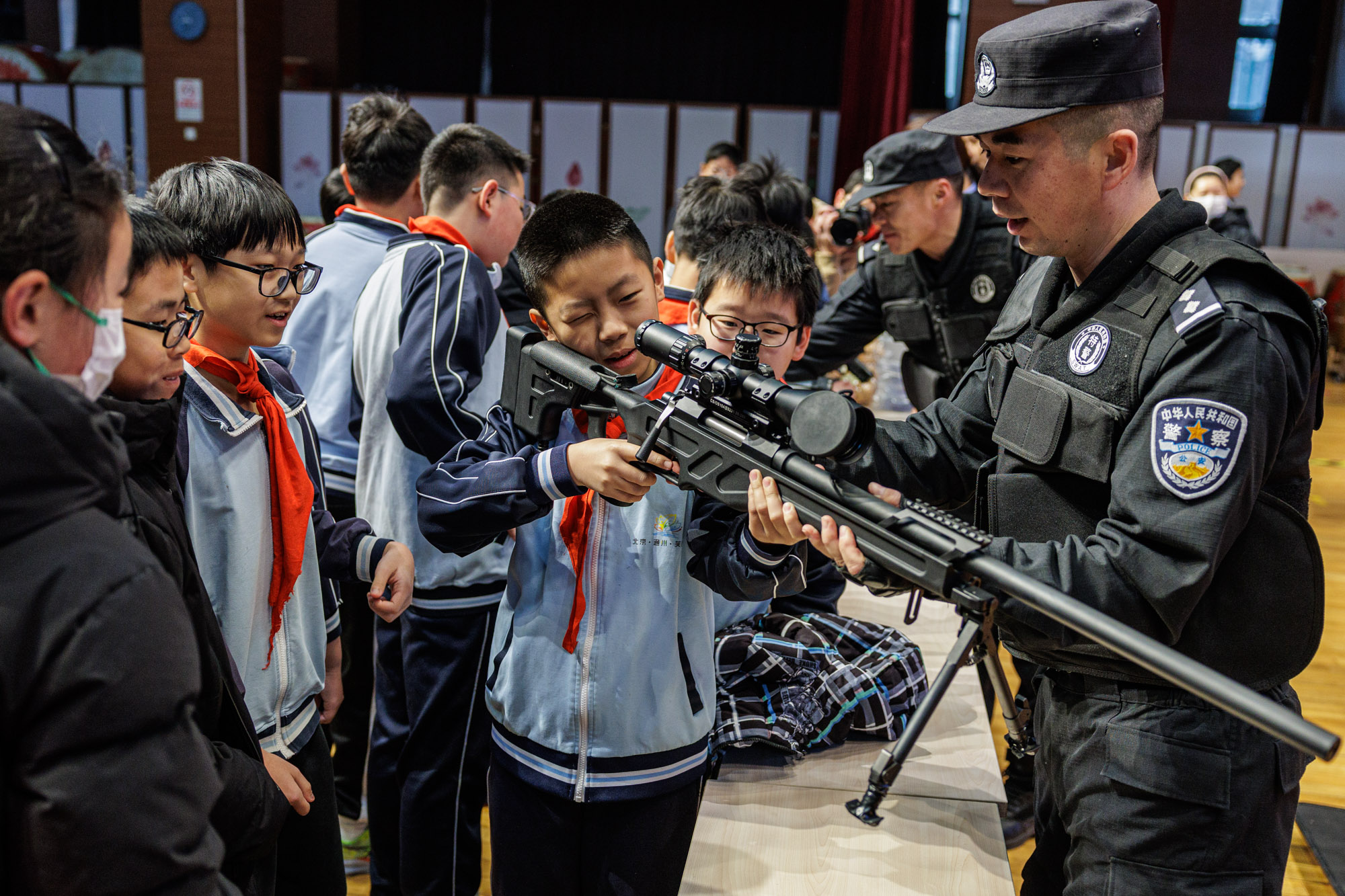 小学生们在警察指导下体验枪械。新京报记者 王子诚 摄