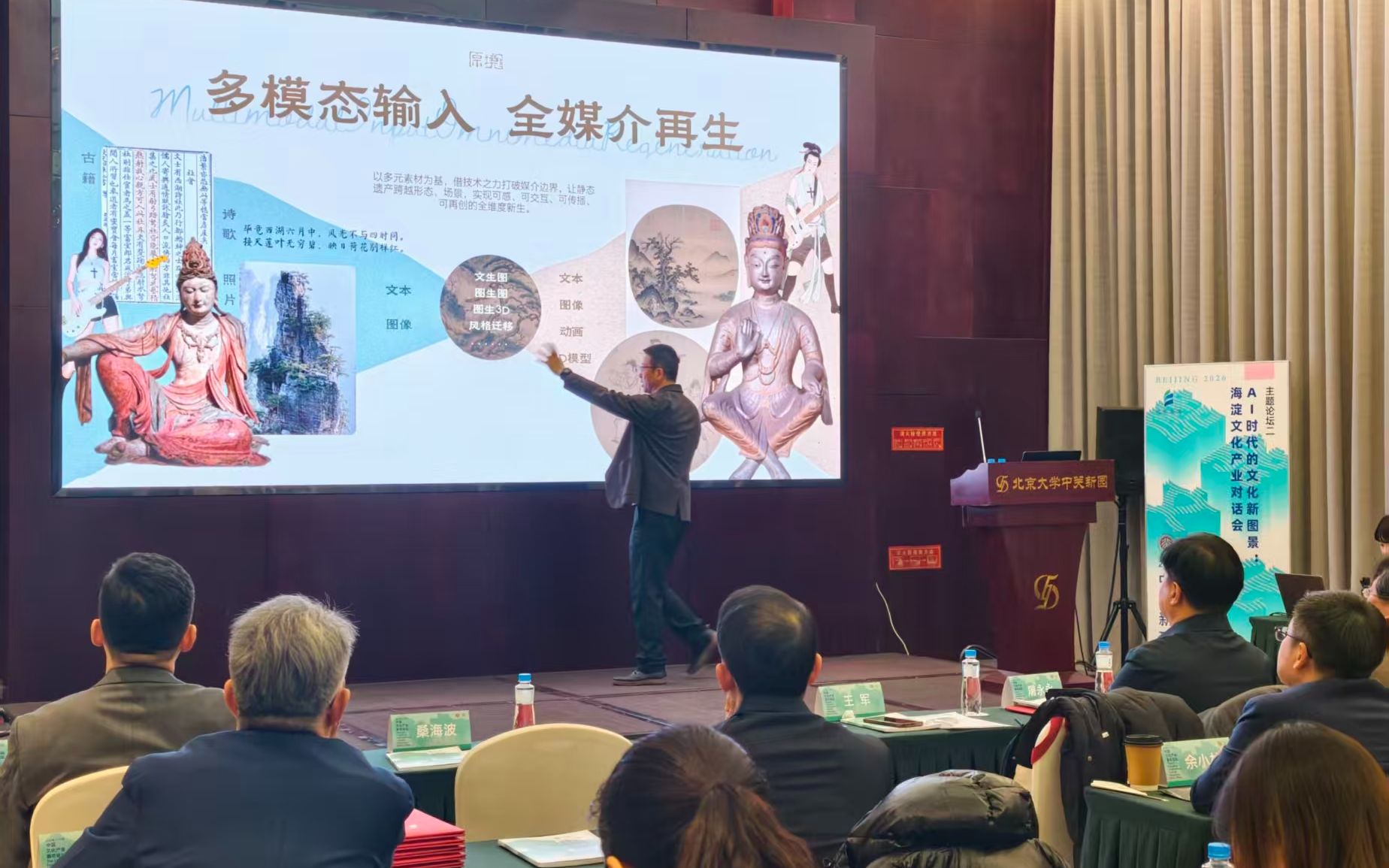 在“洞见·主题演讲”环节,多位来自高校、科研机构及企业的专家学者,围绕人工智能赋能文化创新展开分享。北京大学信息管理系教授、数字人文研究中心主任王军以“原境智生”为题,介绍AI赋能智能文旅体验的实践探索;北京大学智能学院研究员袁晓如从“人文智能(AI4Humanities)”视角,阐释文化计算从数据走向洞见的研究进展;中国音乐学院教授桑海波围绕国家声景港建设,探讨声音资产生态链的构建路径。论坛活动还举行了以“文化创新的‘开源模式’:海淀的探索与实践”为主题的圆桌对话。