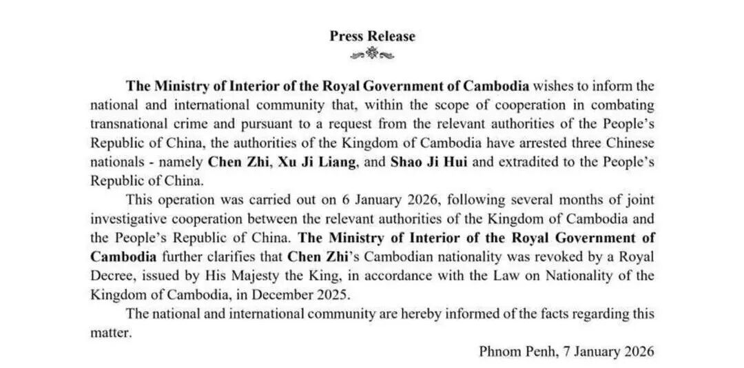据广西日报微信公众号消息,广西国际传播中心(柬埔寨)国际传播联络站记者从柬埔寨内政部获悉,柬埔寨内政部1月7日发布通告:在打击跨国犯罪合作框架下,应中国有关部门请求,柬埔寨执法机关近日成功逮捕并遣返的3名中国籍人员分别为陈志(Chen Zhi)、Xu Ji Liang和Shao Ji Hui。