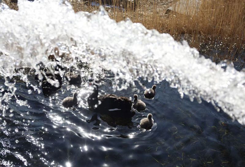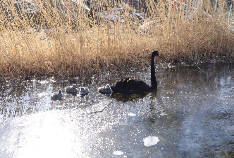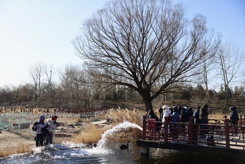 为守护黑天鹅的安全,园内特意开启水泵,维持一片不冻的安全活动水域。