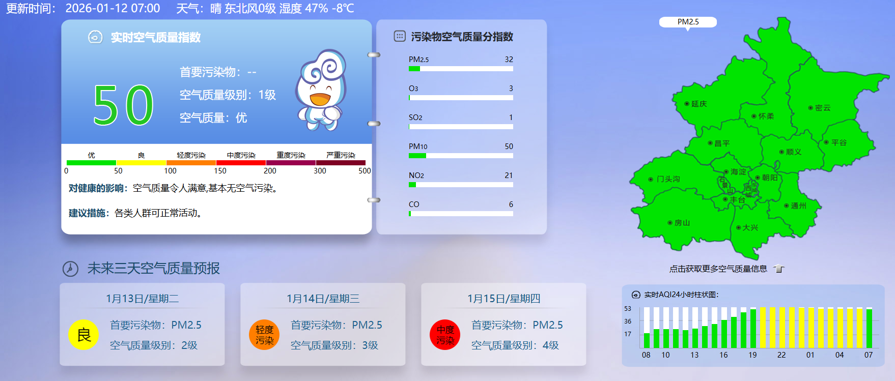 据北京市生态环境监测中心今早7时数据,目前实时空气质量指数50,空气质量优。