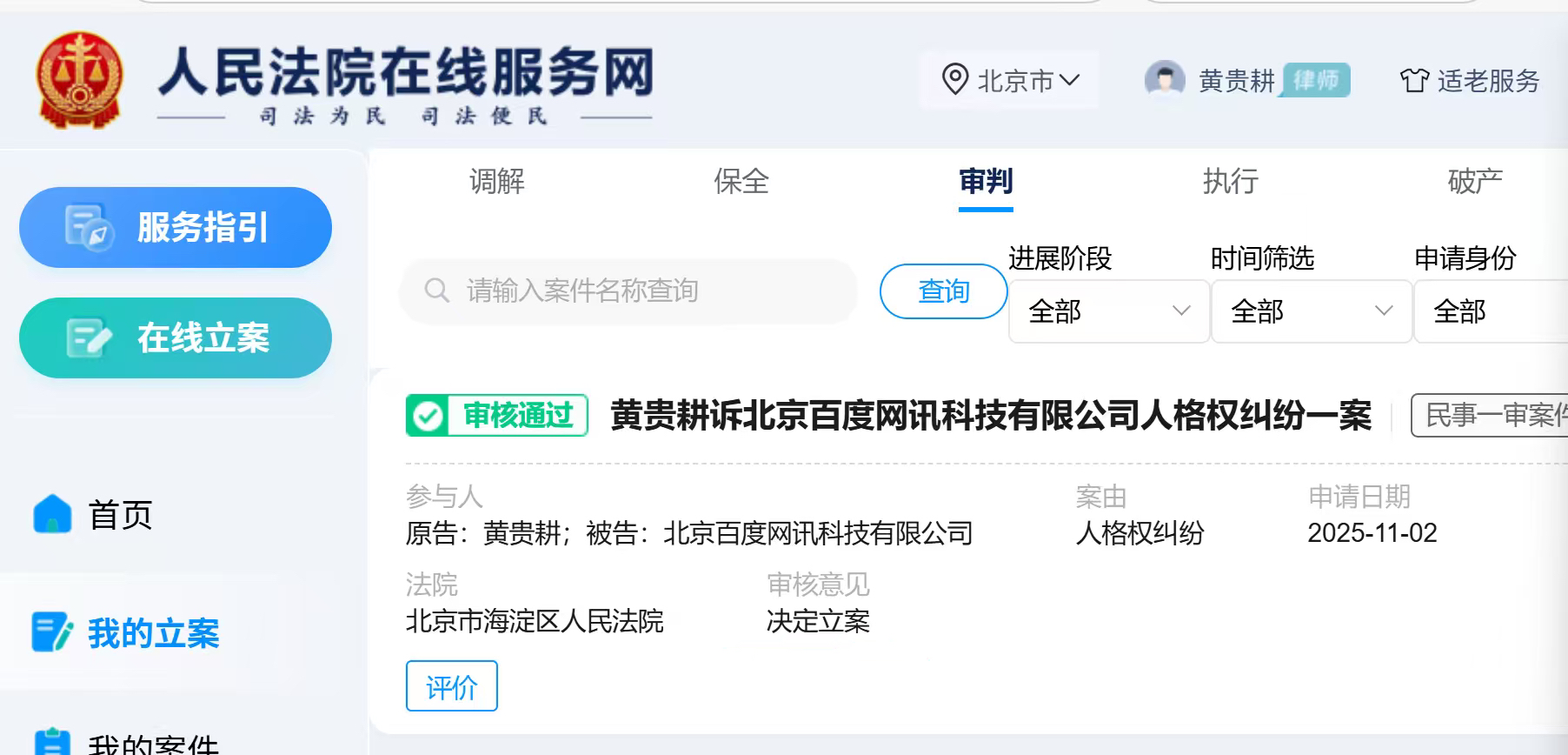 2025年11月,北京海淀区人民法院受理黄贵耕诉百度公司的人格权纠纷案。受访者供图