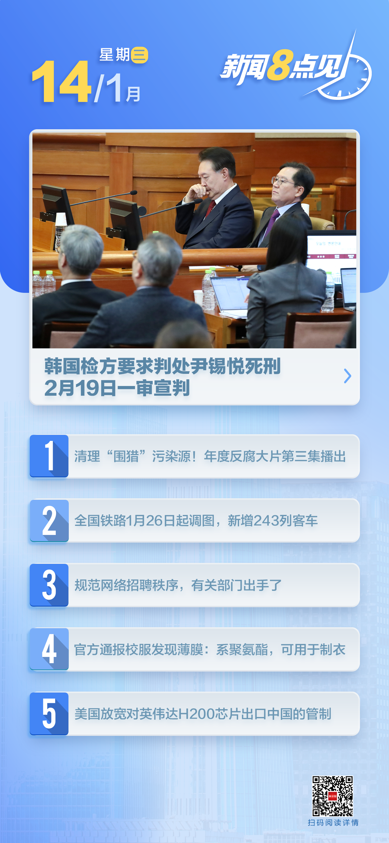 当地时间1月14日凌晨,韩国首尔中央地方法院宣布,将于韩国时间2月19日15时(北京时间2月19日14时)对前总统尹锡悦涉嫌触犯“内乱罪”一案进行一审宣判。在13日晚进行的该案一审结案庭审中,韩国检方要求法院以内乱头目嫌疑判处尹锡悦死刑。(央视新闻)阅读全文>>>