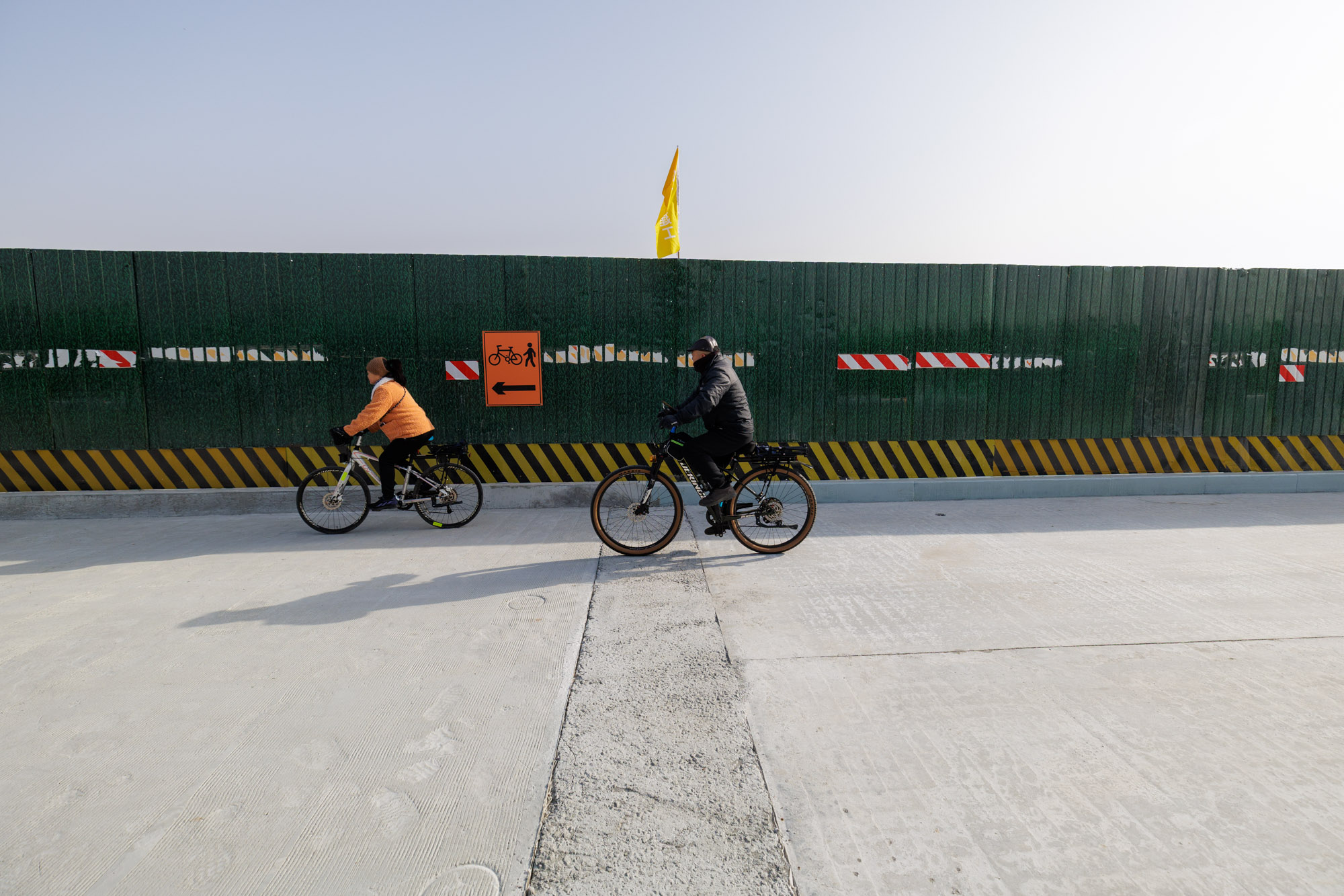 村民骑行在新桥与旧桥连接处。新京报记者 王子诚 摄