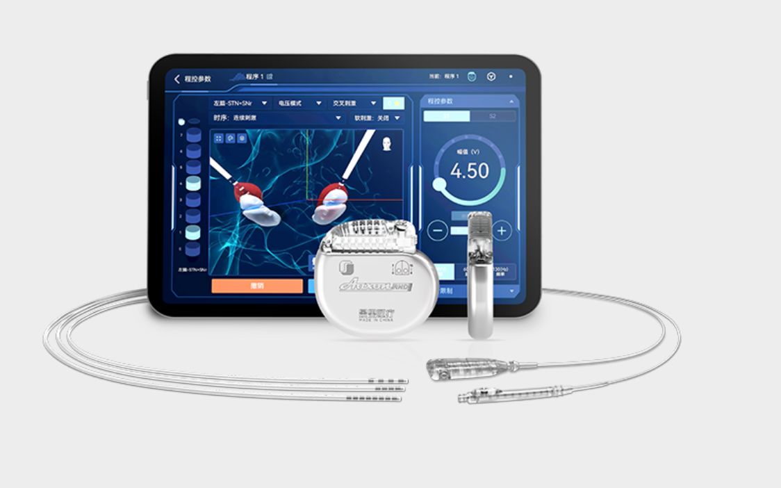申办企业生产的脑深部电刺激系统,其中包括刺激器、导线、电池、体外程控器。网络截图
