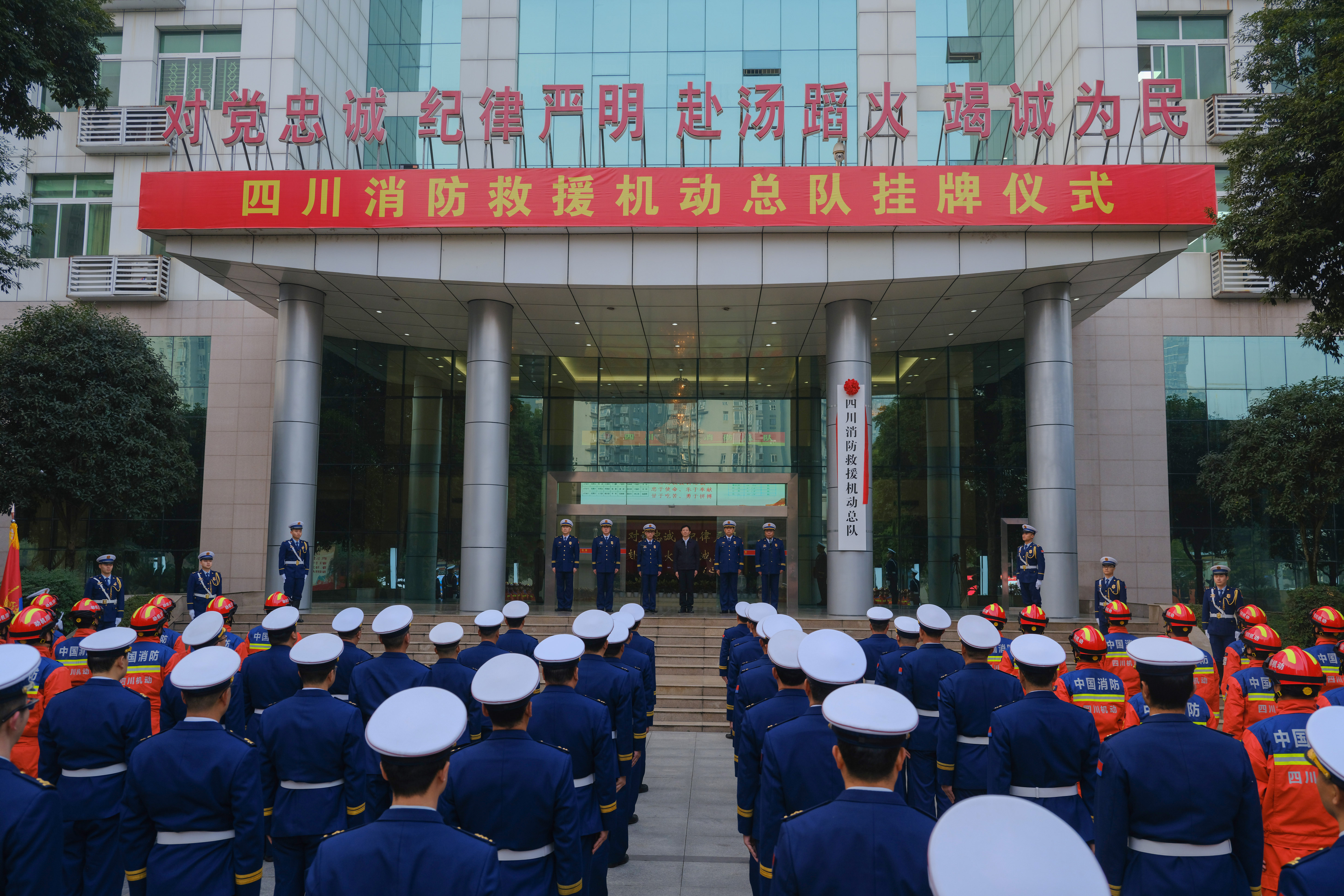 四川消防救援机动总队党委书记、政治委员王立新在挂牌仪式上致辞,号召全体指战员聚焦驻地灾害事故特点,强化实战化练兵,深化跨区域机动救援协同演练,加快补齐特种救援装备短板,全面提升队伍在复杂环境下的应急处置能力,当好驻地的“应急尖兵”和人民群众的“守夜人”。