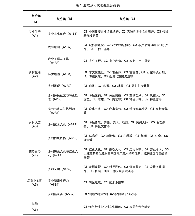 基于北京市乡村文化资源的内核与特征,紧扣农业产业在乡村发展中的基础性地位,突出乡村文化的独特“农业”属性,构建层级清晰的北京市乡村文化资源分类体系:一级分类涵盖6项(农业生产类、乡村生活类、乡村文艺类、德治自治类、后农业文明类及其他),二级分类细化为13项,三级分类拓展至60余项(详见表1)。经系统梳理,当前北京市共有乡村优质文化资源要素7500余项(不含41865株古树名木)。