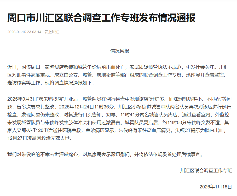 2025年9月3日“老朱鸭货店”开业后,城管队员在例行检查中发现该店“灶炉多、抽油烟机功率小、不匹配”等问题,曾多次要求其整改。2025年12月24日11时36分,川汇区小桥街道城管中队两名队员再次对该店进行例行检查,发现问题仍未整改,对其进行口头告知、劝导,11时41分两名城管队员离店。通过查看室内、外监控未发现城管队员与朱俊峰发生肢体冲突和使用过激语言。城管队员离店后,约11时50分朱俊峰突发不适,其家人立即拨打120电话送往医院急救,急诊病历显示,朱俊峰有既往高血压病史,头颅CT提示为脑内出血, 12月27日凌晨因救治无效去世。