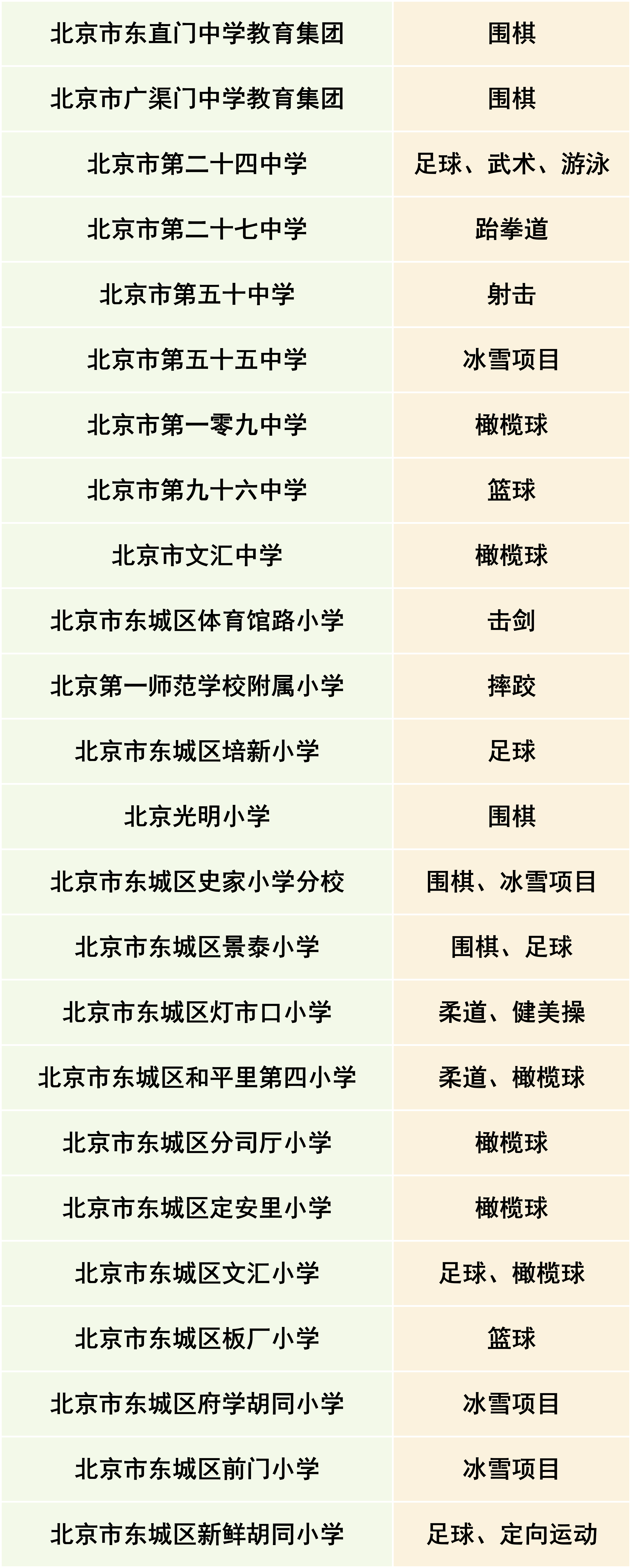 2025年至2027年东城区体育传统项目学校(区级第二批)名单。图/“北京东城”微信公众号