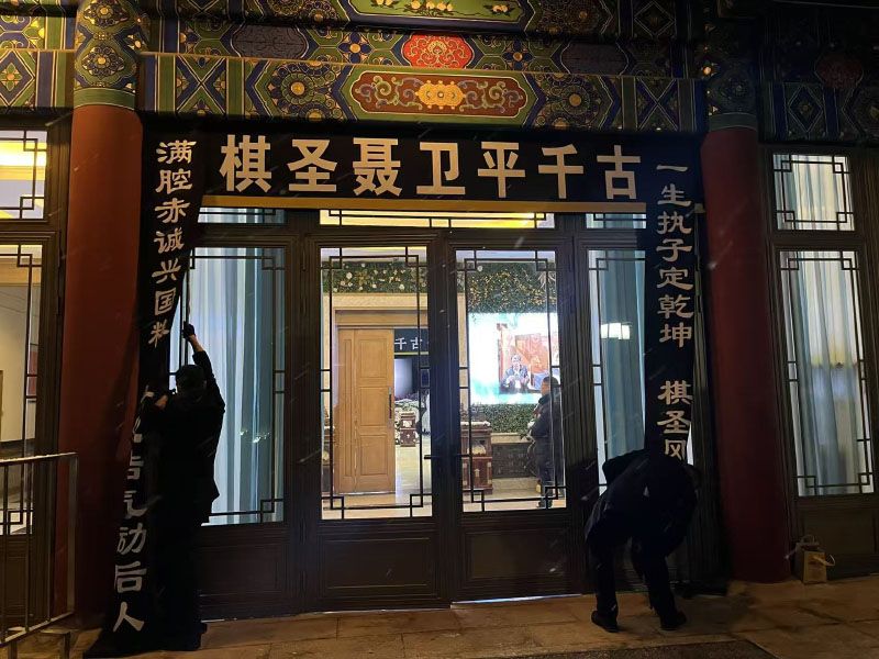 1月18日8时,聂卫平先生告别仪式将在八宝山殡仪馆东礼堂举行。六时许,八宝山东礼堂,悬挂起缅怀 “棋圣” 聂卫平的挽联。