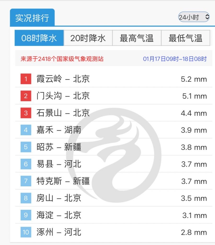 新京报讯(记者王景曦)根据国家级气象观测站数据,过去24小时中(1月17日9:00至1月18日8:00),北京霞云岭、门头沟、石景山的国家级气象站监测到的降雪量在全国排名前三。
