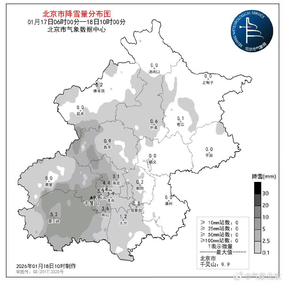 据北京市气象台预计,目前大部地区降雪基本结束,但山区、大兴和通州等的局地仍有零星小雪。1月17日6时至18日10时,全市平均降雪量为1.2毫米,城区平均1.6毫米,最大降雪量出现在丰台区千灵山,为9.9毫米;最近一小时(9-10时)最大降雪量在门头沟高山玫瑰园,为0.2毫米。