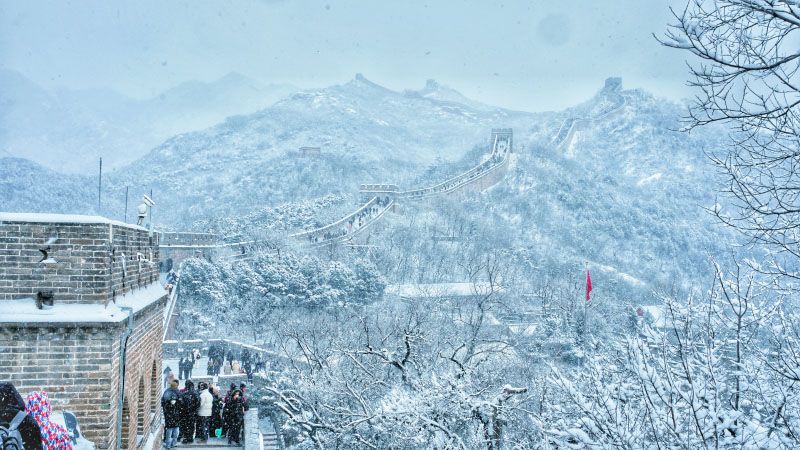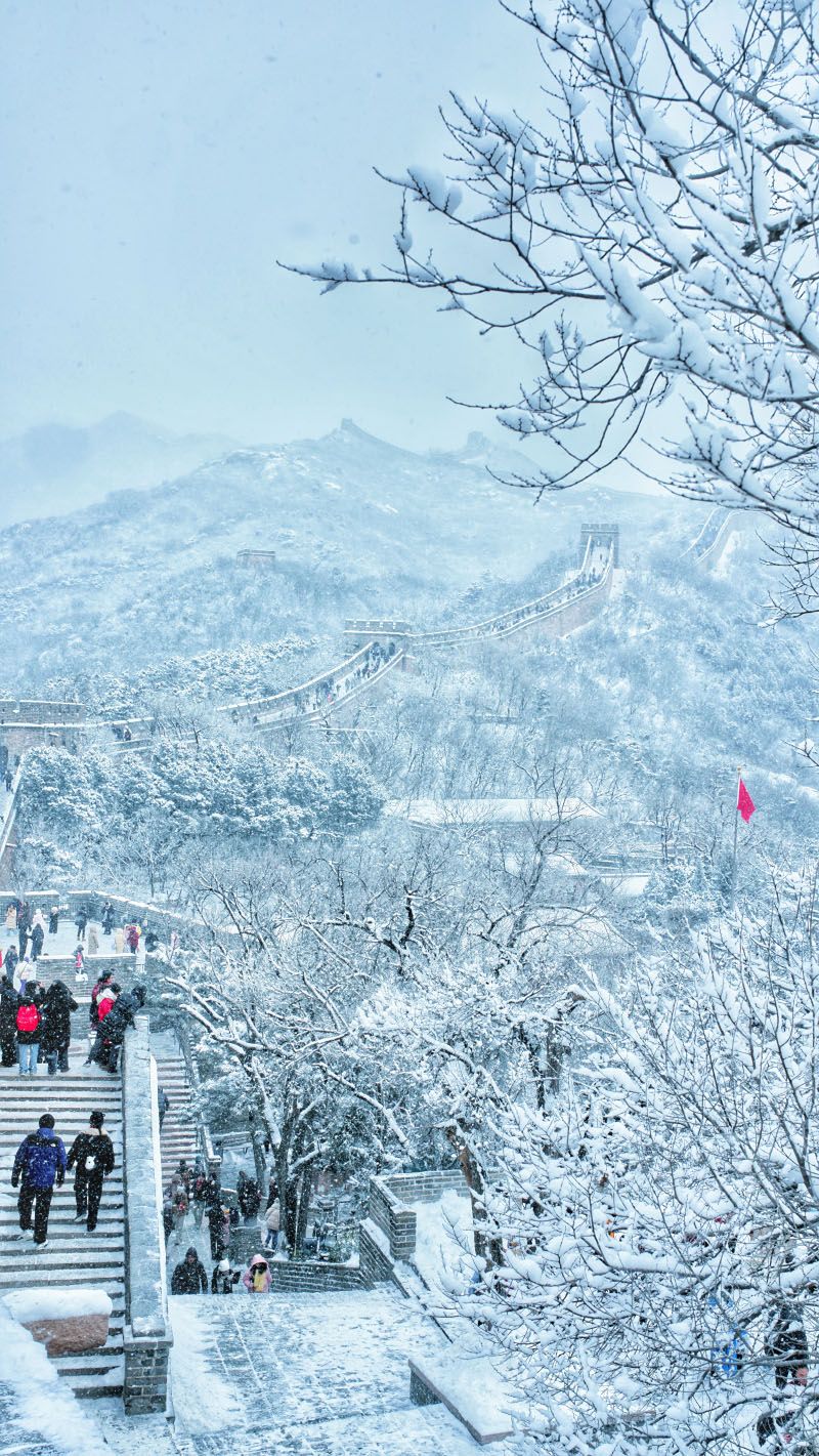 1月18日,八达岭长城景区迎来新年初雪,呈现出北国风光“冰封雪飘”壮美画卷。白雪皑皑中,蜿蜒的城墙与烽火台银装素裹,吸引众多游客和摄影爱好者前来观赏,游客们纷纷捕捉长城雪景的独特魅力,定格2026新年初雪的精彩瞬间。